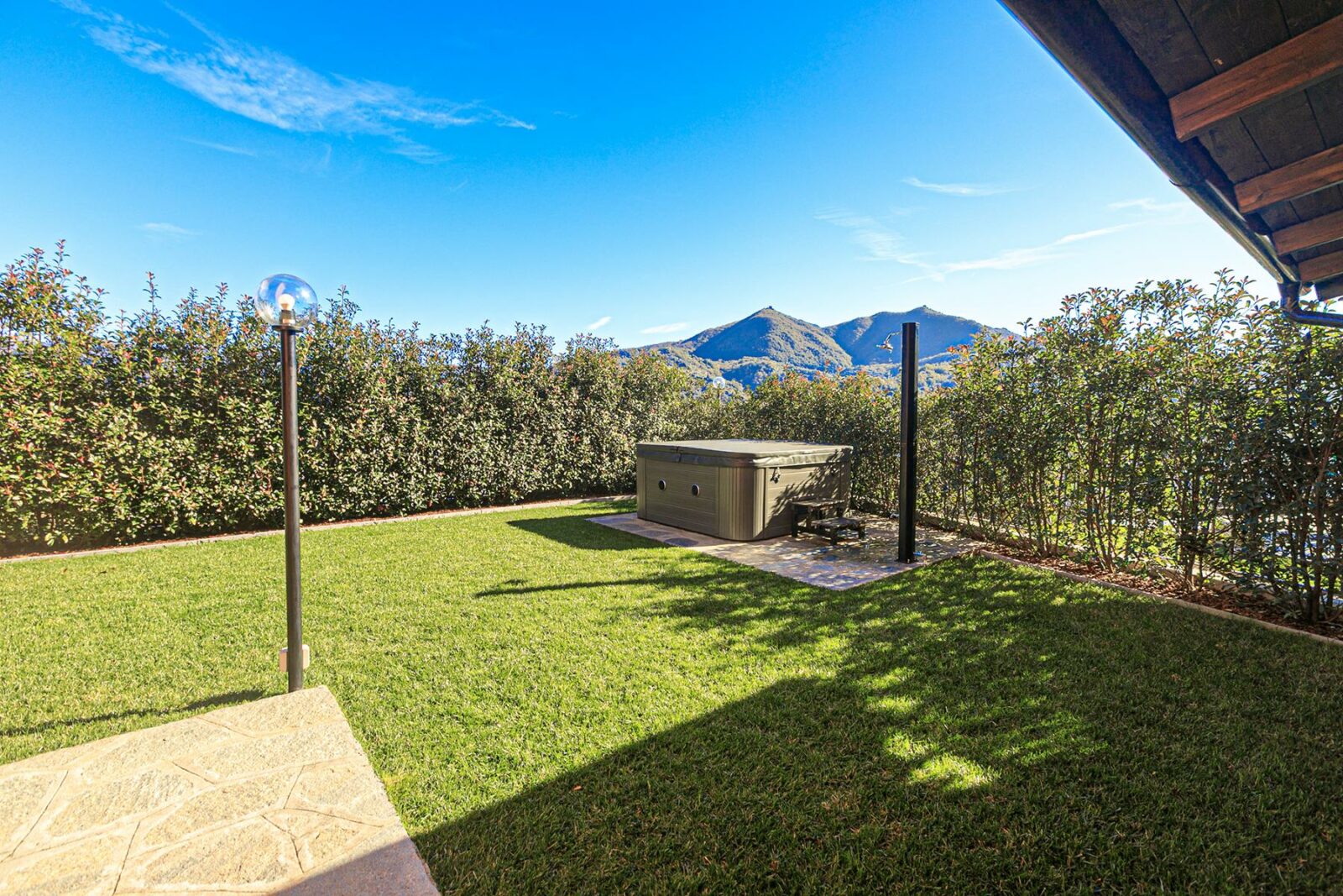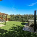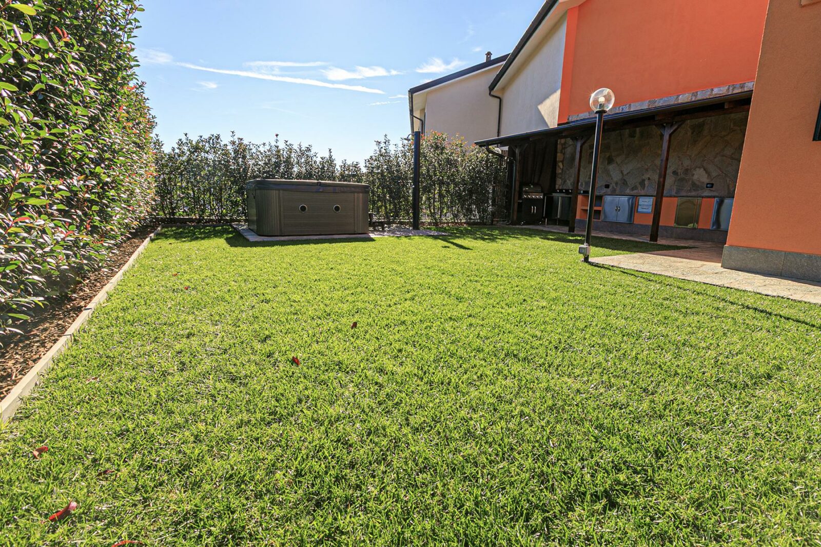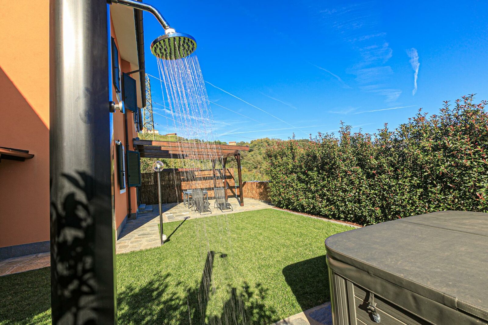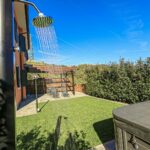 Lo spazio outdoor è ampio e perfettamente organizzato: una splendida zona conviviale con pergola in legno e telo motorizzato, un’area relax con prato all’inglese, piscina idromassaggio e doccia, e una zona barbecue con cucina in acciaio e muratura, completamente attrezzata e protetta da tettoia.