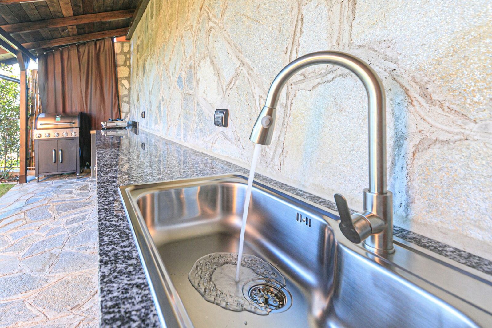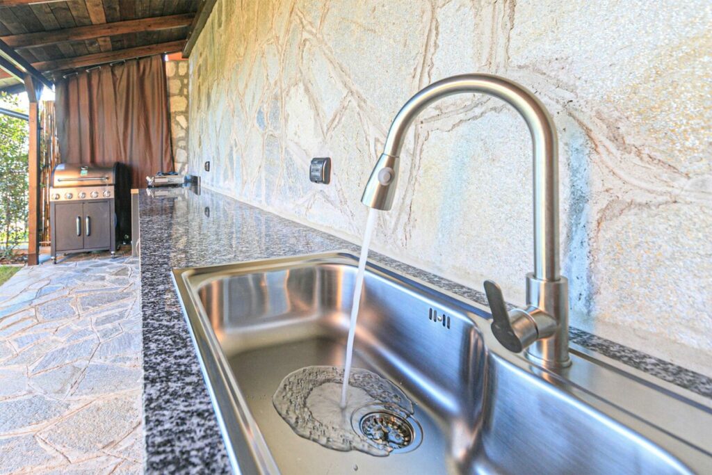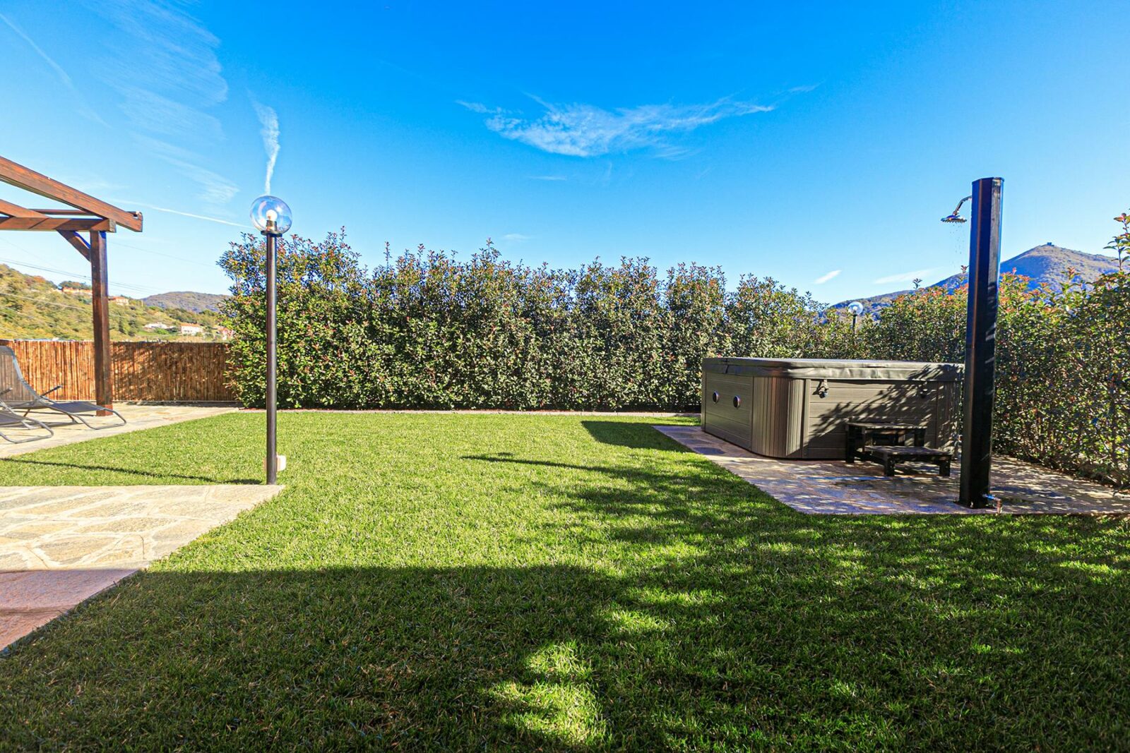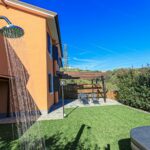Lo spazio outdoor è ampio e perfettamente organizzato: una splendida zona conviviale con pergola in legno e telo motorizzato, un’area relax con prato all’inglese, piscina idromassaggio e doccia, e una zona barbecue con cucina in acciaio e muratura, completamente attrezzata e protetta da tettoia.