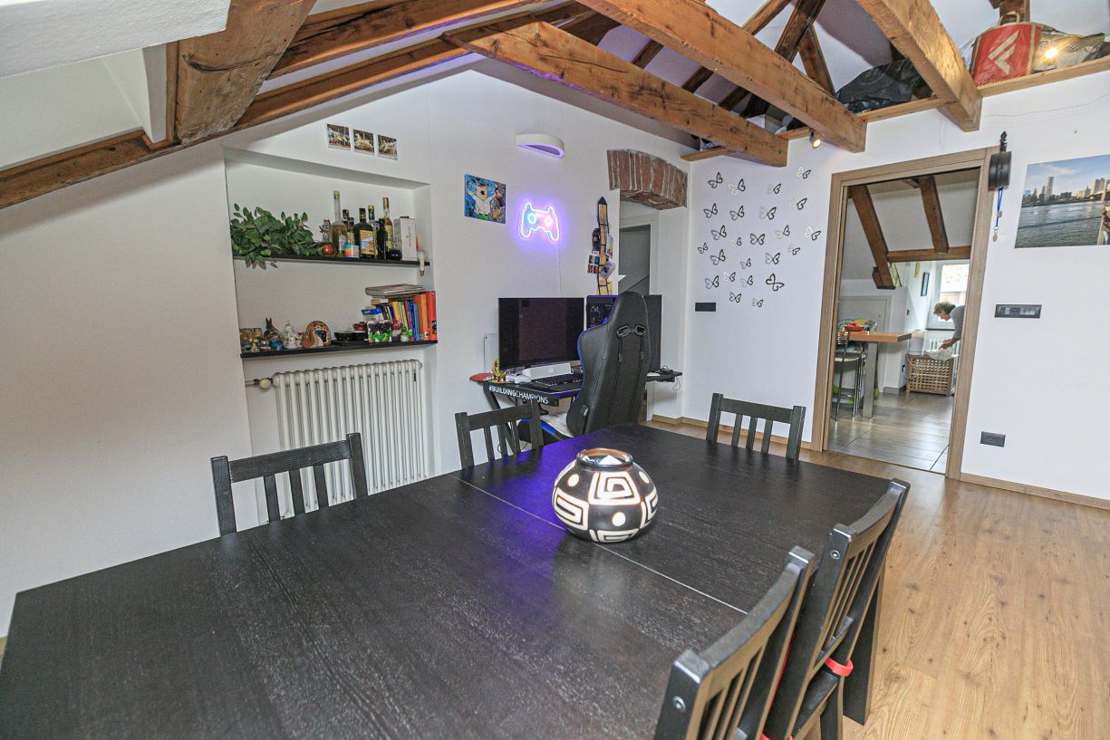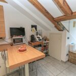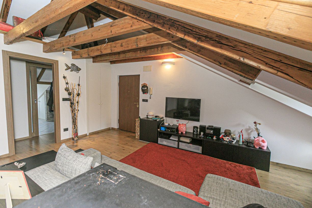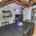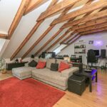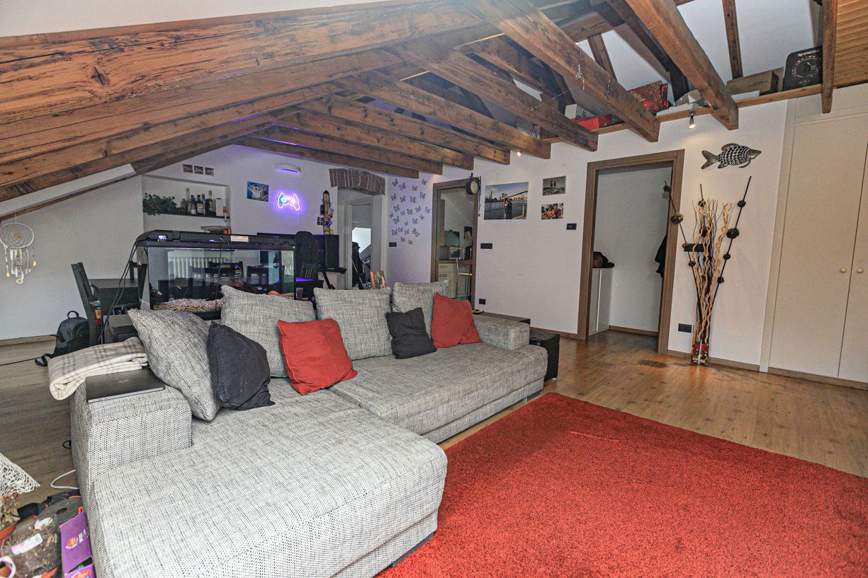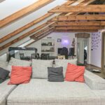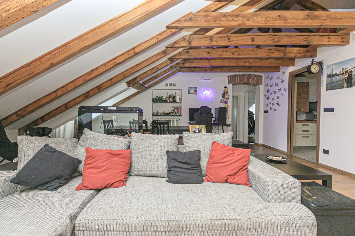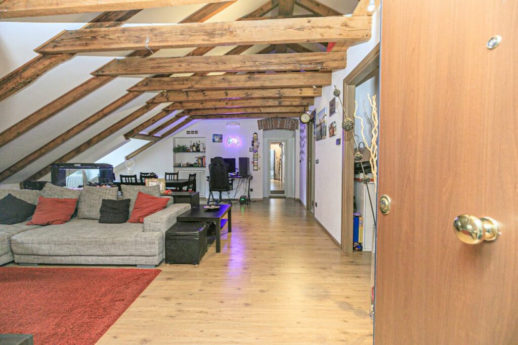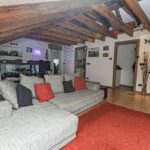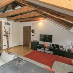 - ingresso in grande salone con zona giorno e zona pranzo con 2 finestre ad abbaino e travi a vista,