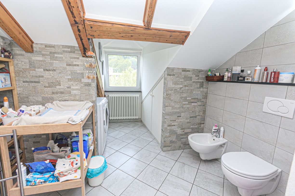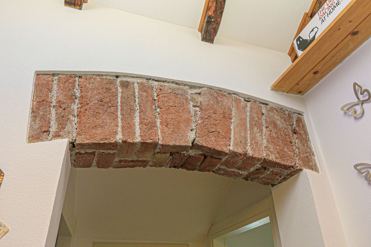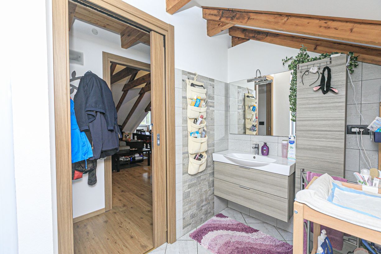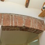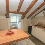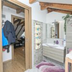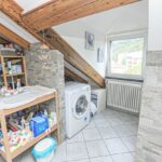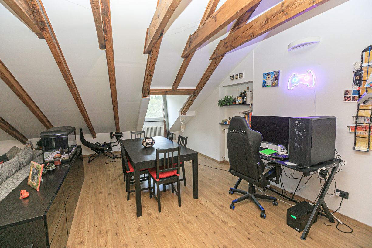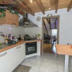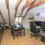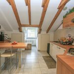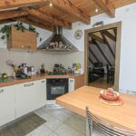 - ingresso in grande salone con zona giorno e zona pranzo con 2 finestre ad abbaino e travi a vista,